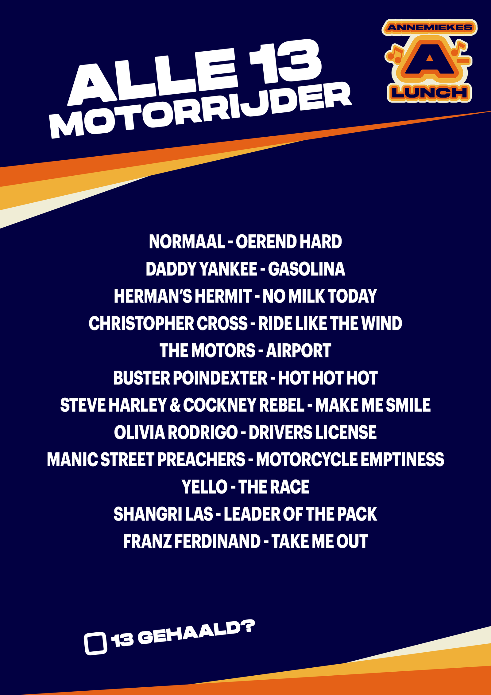 Zondag is het de dag van de motorrijder! Genoeg reden voor luisteraar - en motorrijder - Michel om dát als thema aan te dragen voor de Alle 13!