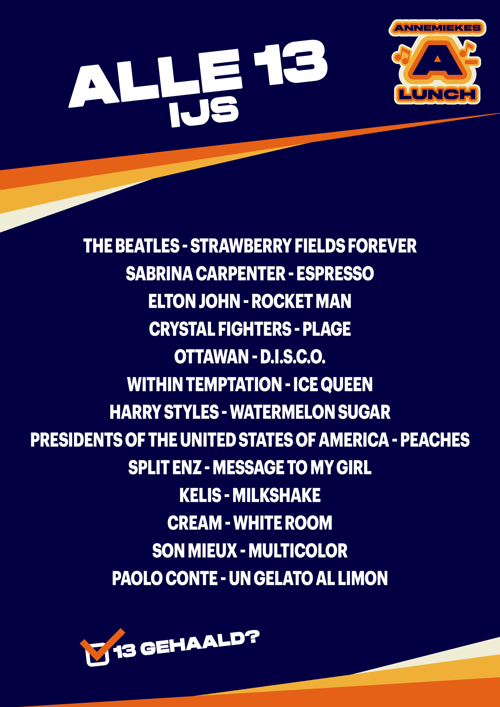 Staat jouw plaat er niet tussen? Probeer het volgende week nog een keer tijdens een nieuwe Alle 13! Heb je een idee voor een leuk thema? Ook deze kun je insturen via de NPO Radio 2 app.