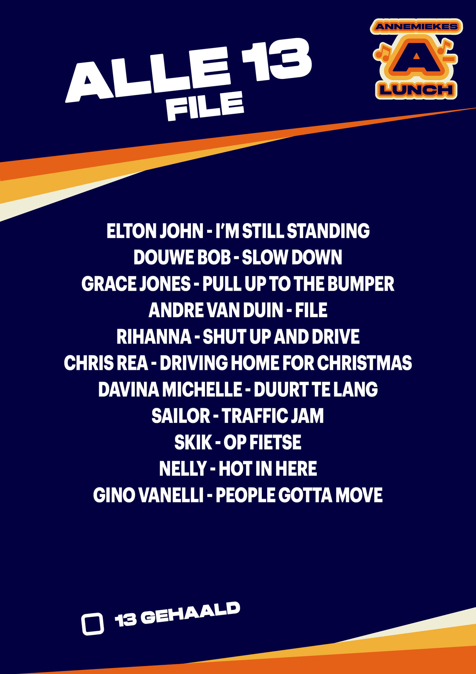 Staat jouw plaat er niet tussen? Probeer het volgende week nog een keer tijdens een nieuwe Alle 13! Heb je een idee voor een leuk thema? Ook deze kun je insturen via de NPO Radio 2 app.