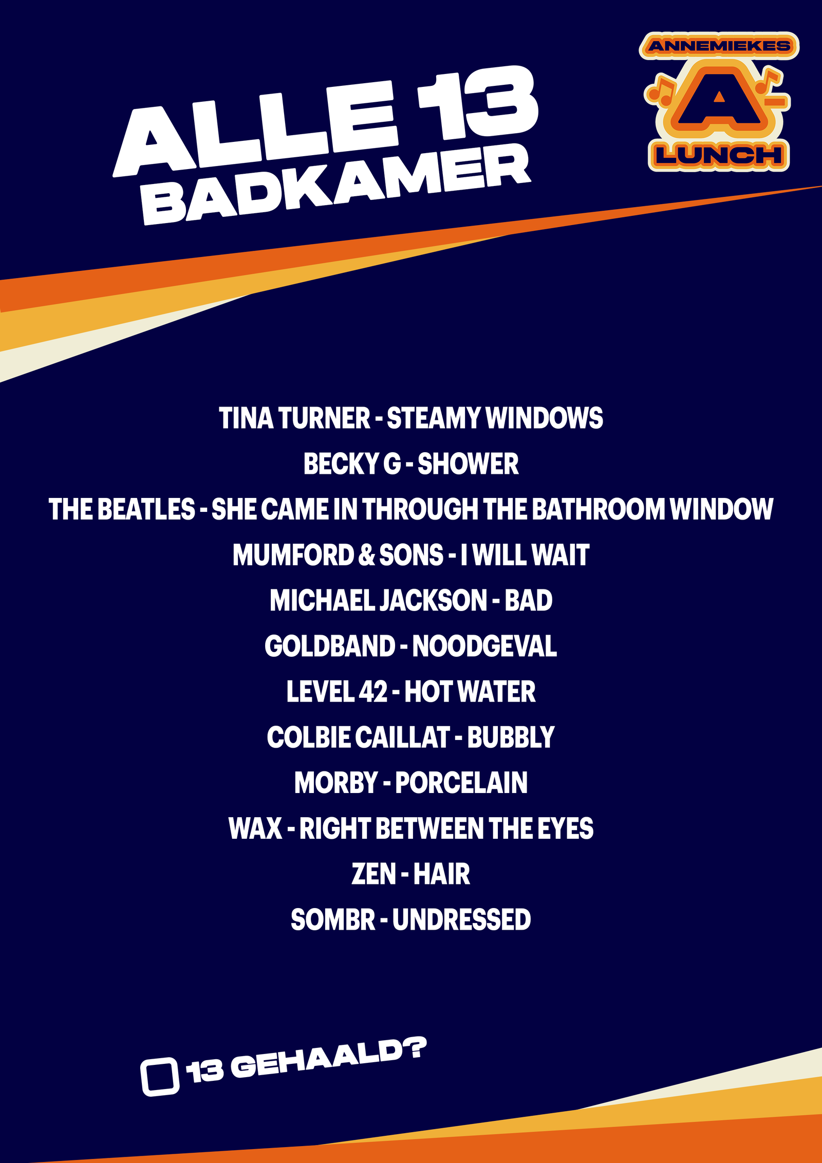 Vandaag draait Alle 13 om de badkamer. Luisteraar Evelien belde: zij en haar partner hebben een nieuw huis gekocht, en daar moeten niet één, maar twee van die "dingen" in. Twee gloednieuwe badkamers dus! En met dat thema kun je natuurlijk alle kanten op. Dit was Alle 13: Badkamer.