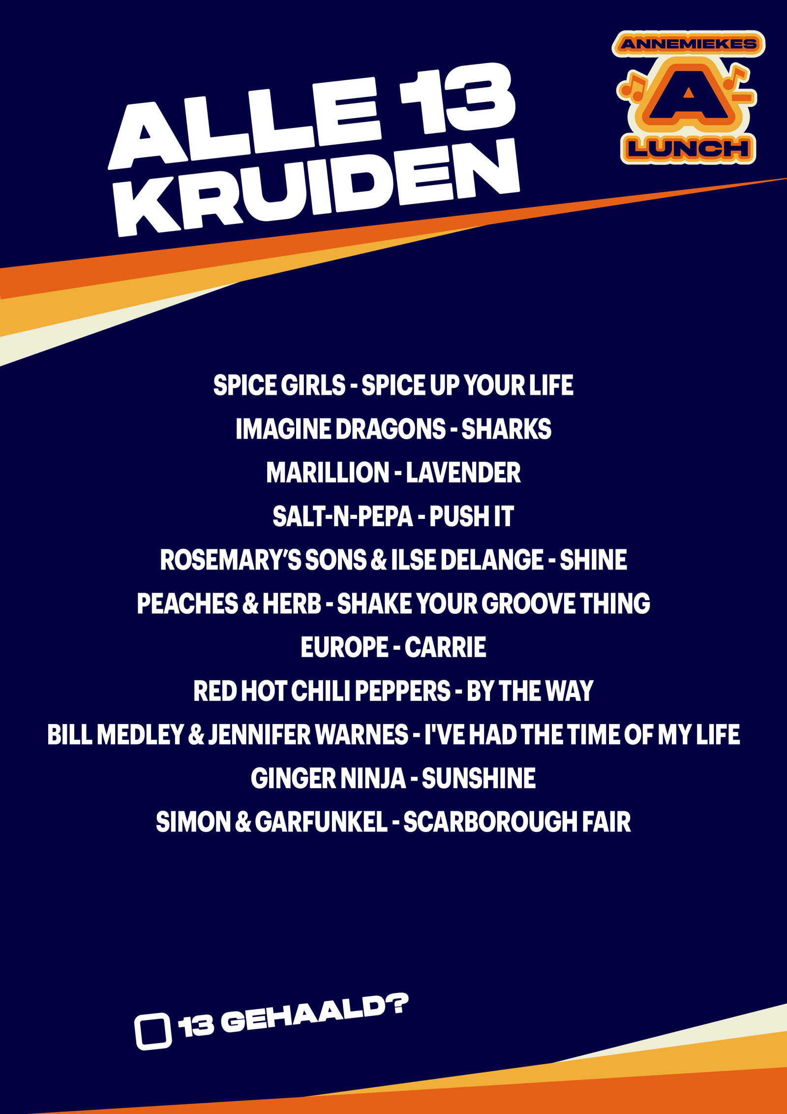 Vandaag draait Alle 13 om kruiden. Luisteraar Ko hing aan de telefoon: hij vindt kruiden wel een smaakvol thema voor Annemiekes A-Lunch. Dit is Alle 13: Kruiden.