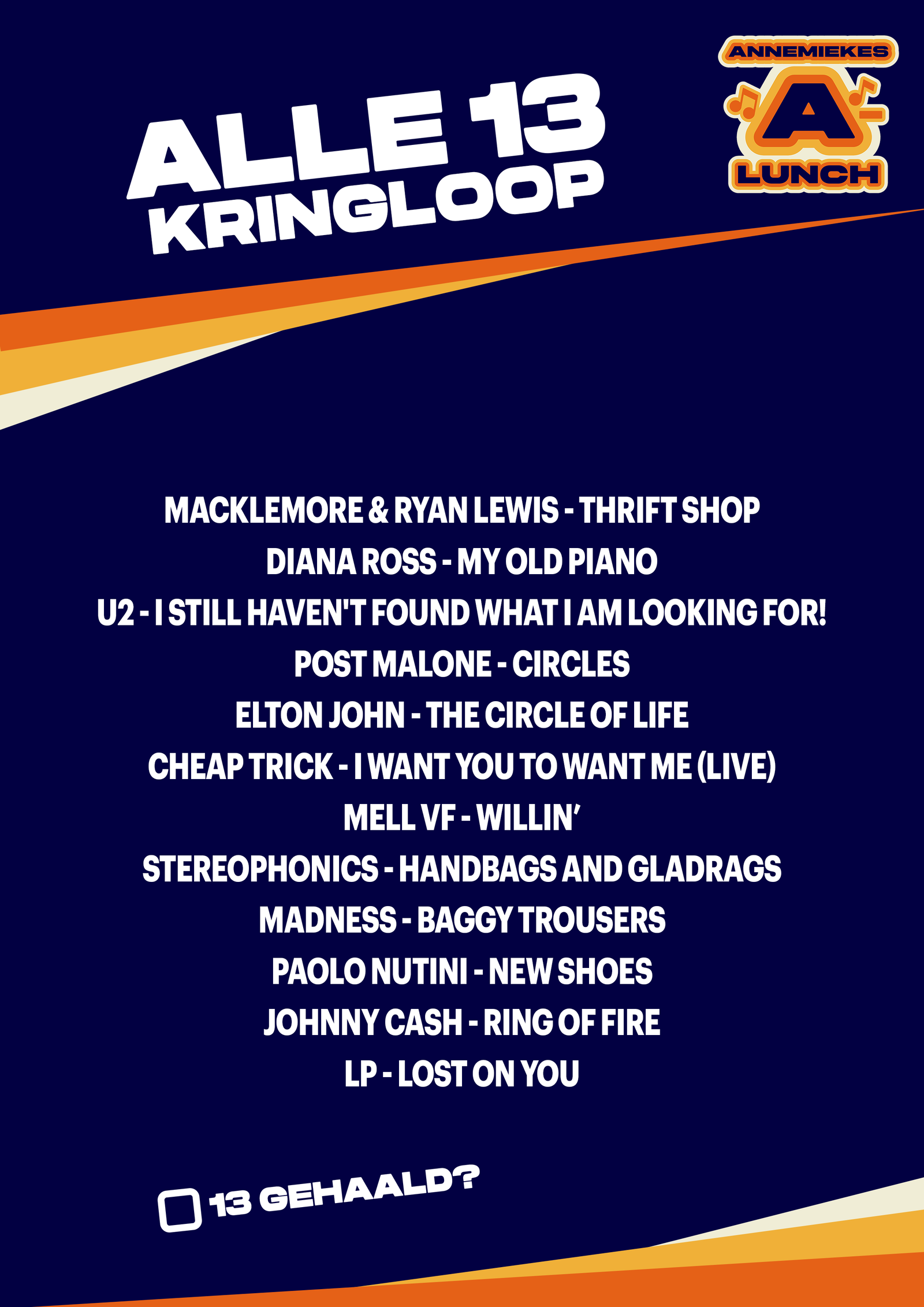 Staat jouw plaat er niet tussen? Probeer het volgende week nog een keer tijdens een nieuwe Alle 13! Heb je een idee voor een leuk thema? Ook deze kun je insturen via de NPO Radio 2 app.