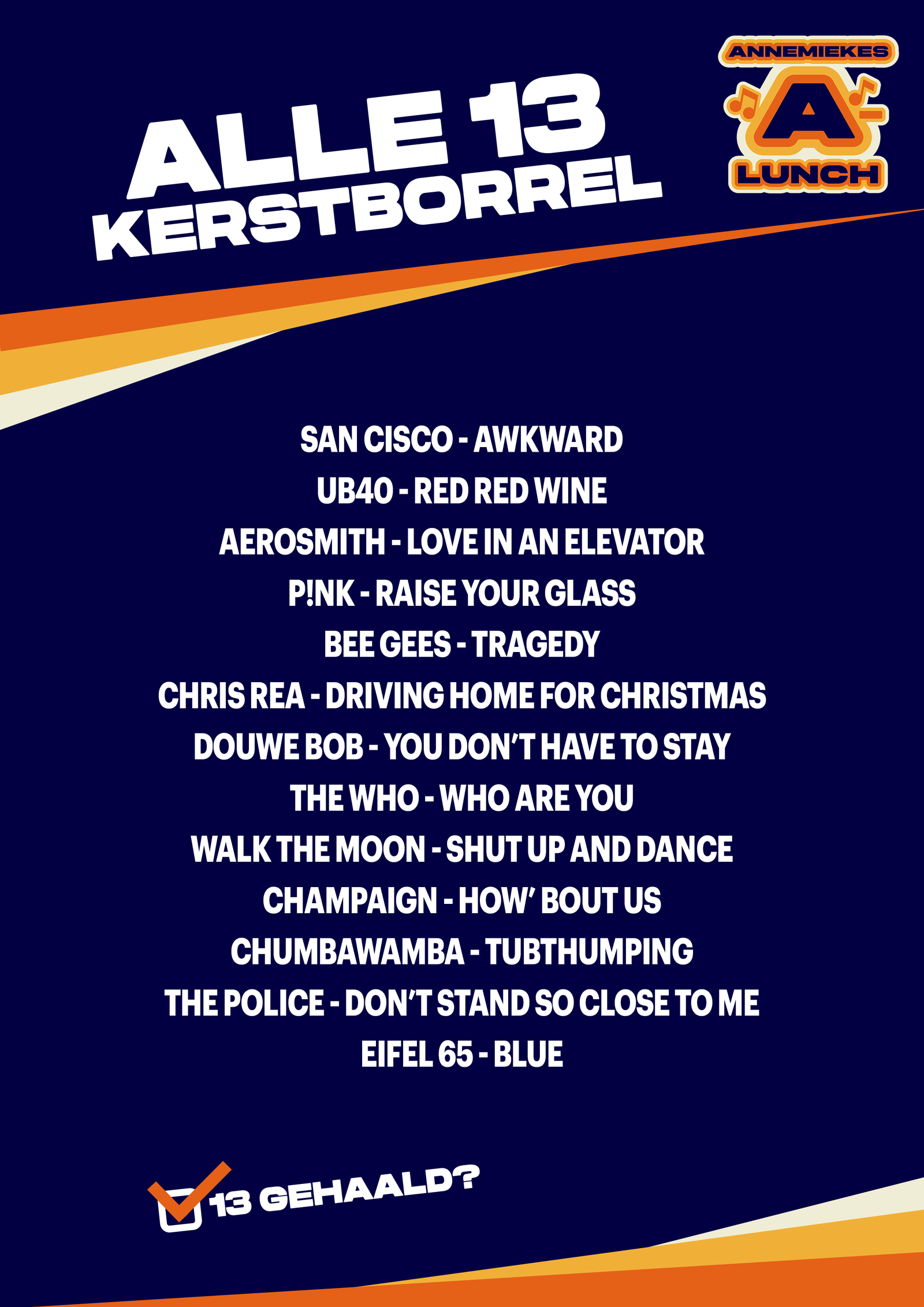 Staat jouw plaat er niet tussen? Probeer het volgende week nog een keer tijdens een nieuwe Alle 13! Heb je een idee voor een leuk thema? Ook deze kun je insturen via de NPO Radio 2 app.