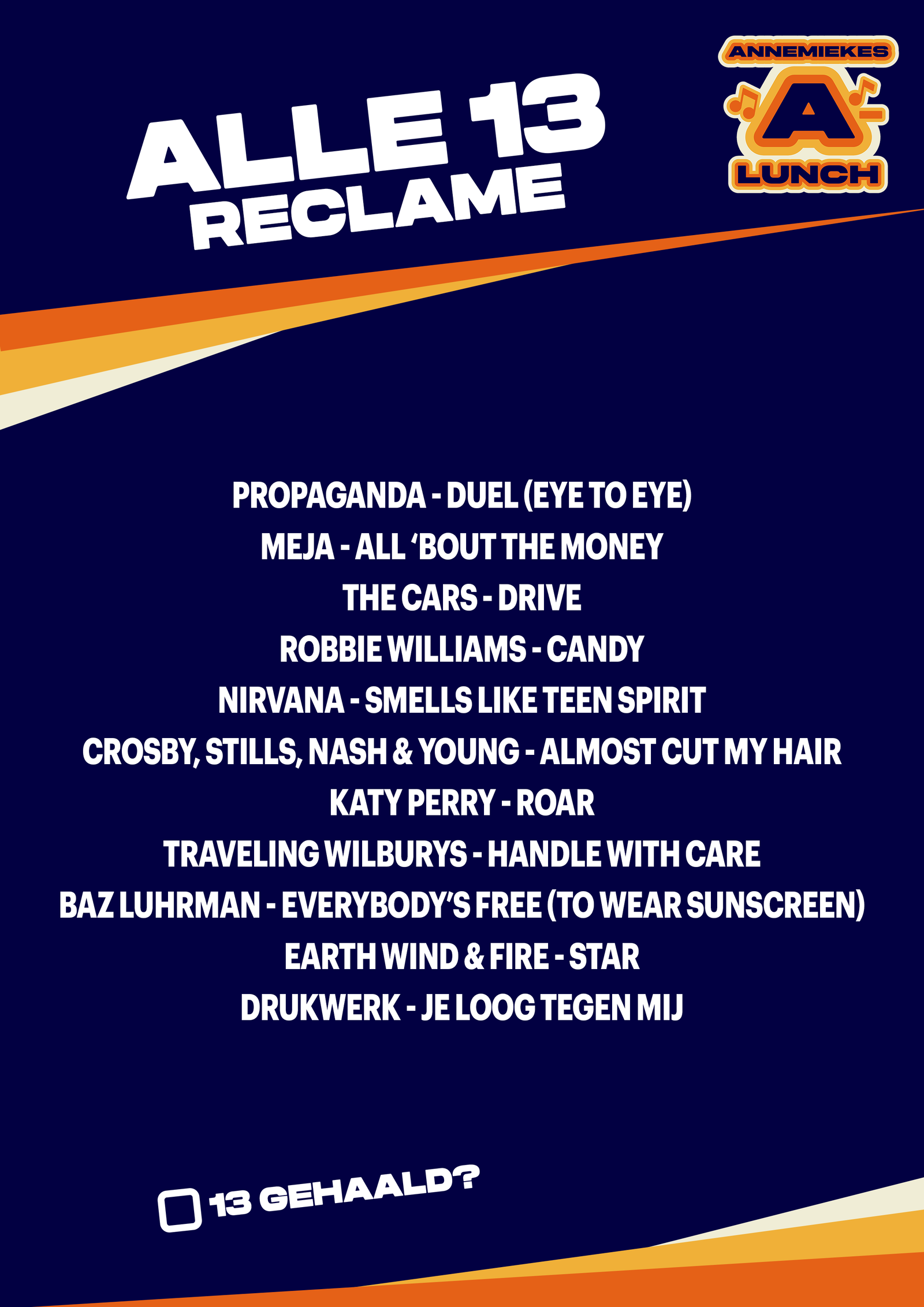 Staat jouw plaat er niet tussen? Probeer het volgende week nog een keer tijdens een nieuwe Alle 13! Heb je een idee voor een leuk thema? Ook deze kun je insturen via de NPO Radio 2 app.