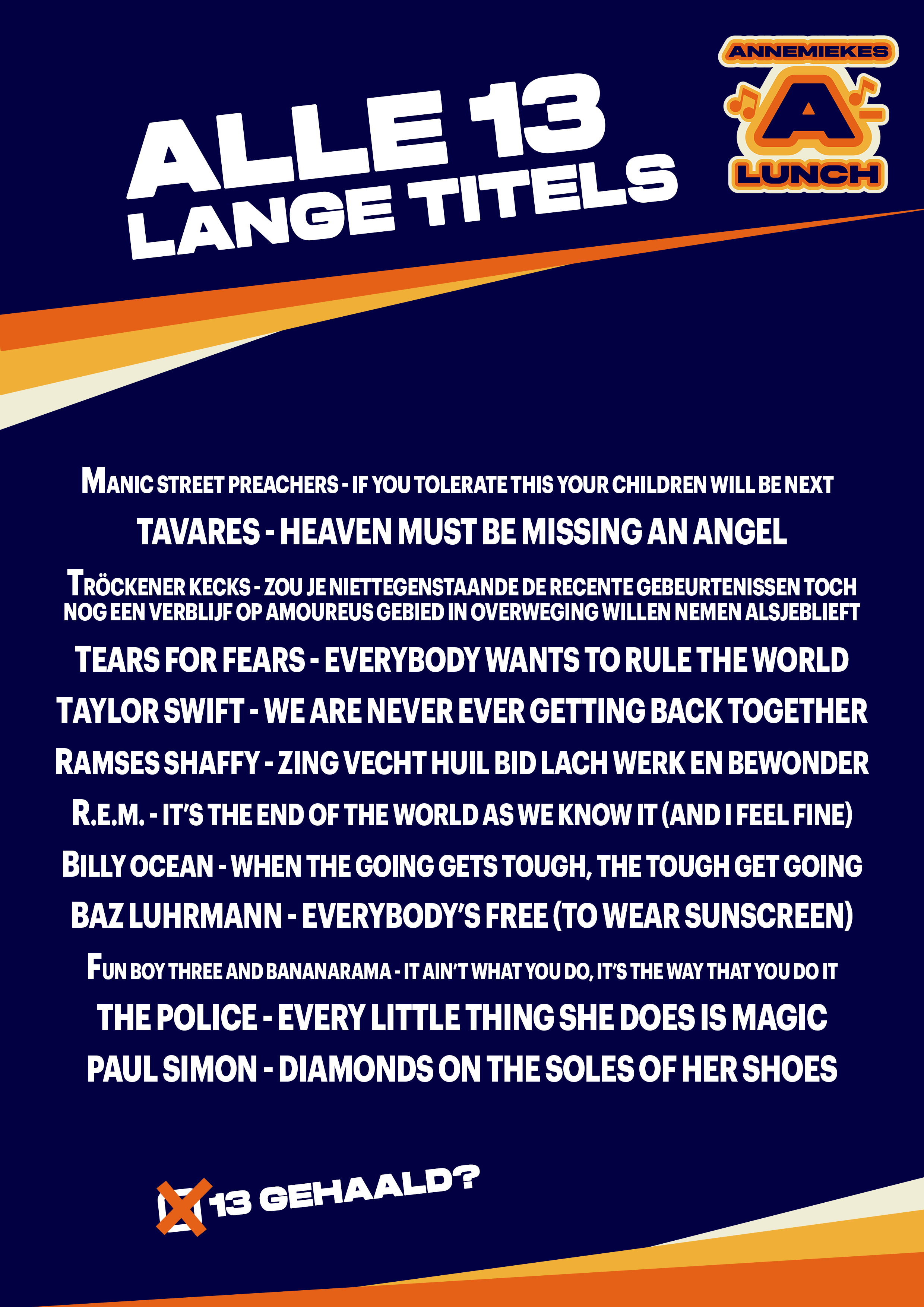 Iedere vrijdag gaat Annemieke in het tweede uur van de A-Lunch, samen met de luisteraars, op zoek naar een overkoepelend muzikaal thema. Vandaag stelde Reinout 'Alle 13: Lange Titels' voor!