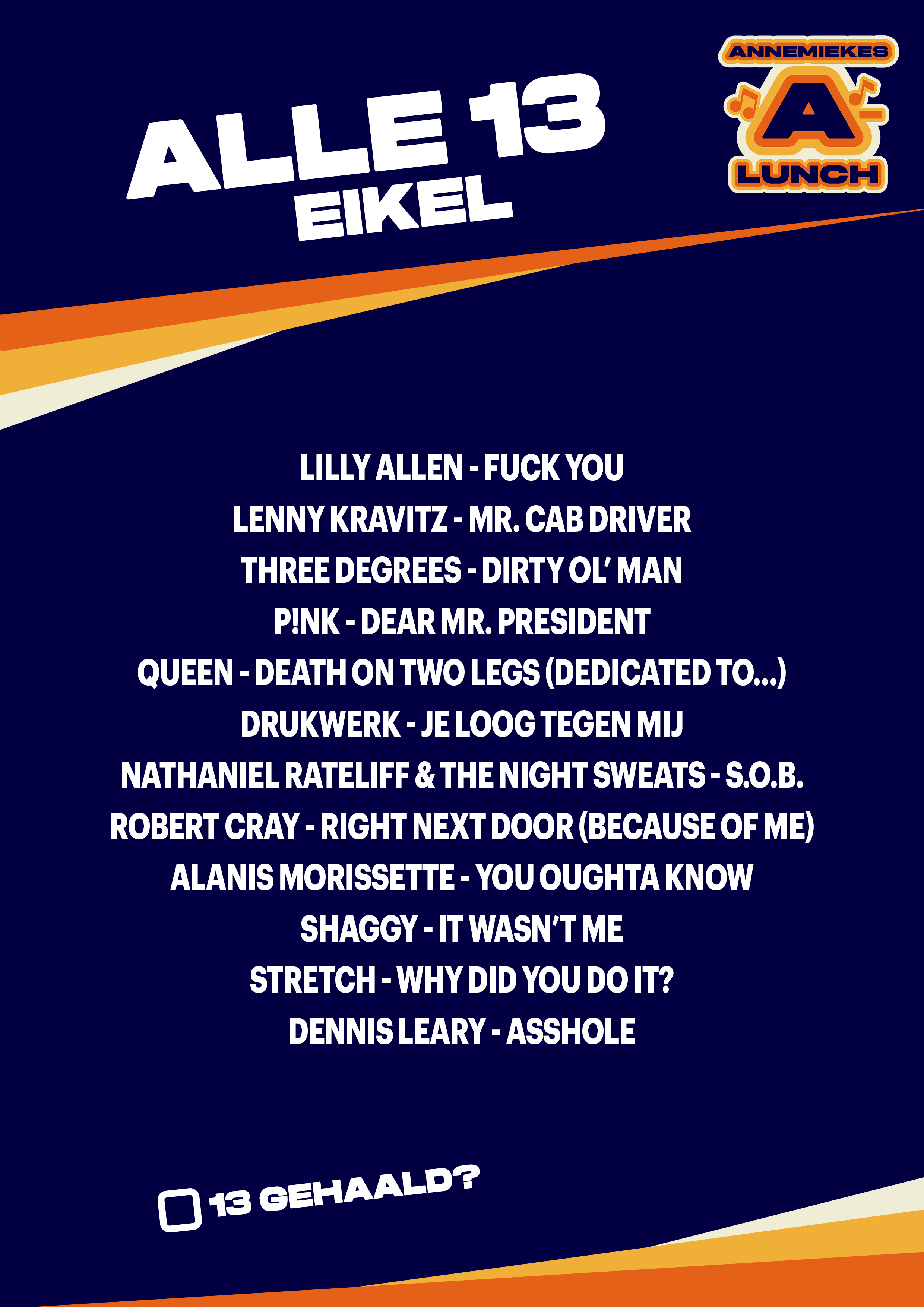 Staat jouw plaat er niet tussen? Probeer het volgende week nog een keer tijdens een nieuwe Alle 13! Heb je een idee voor een leuk thema? Ook deze kun je insturen via de NPO Radio 2 app.