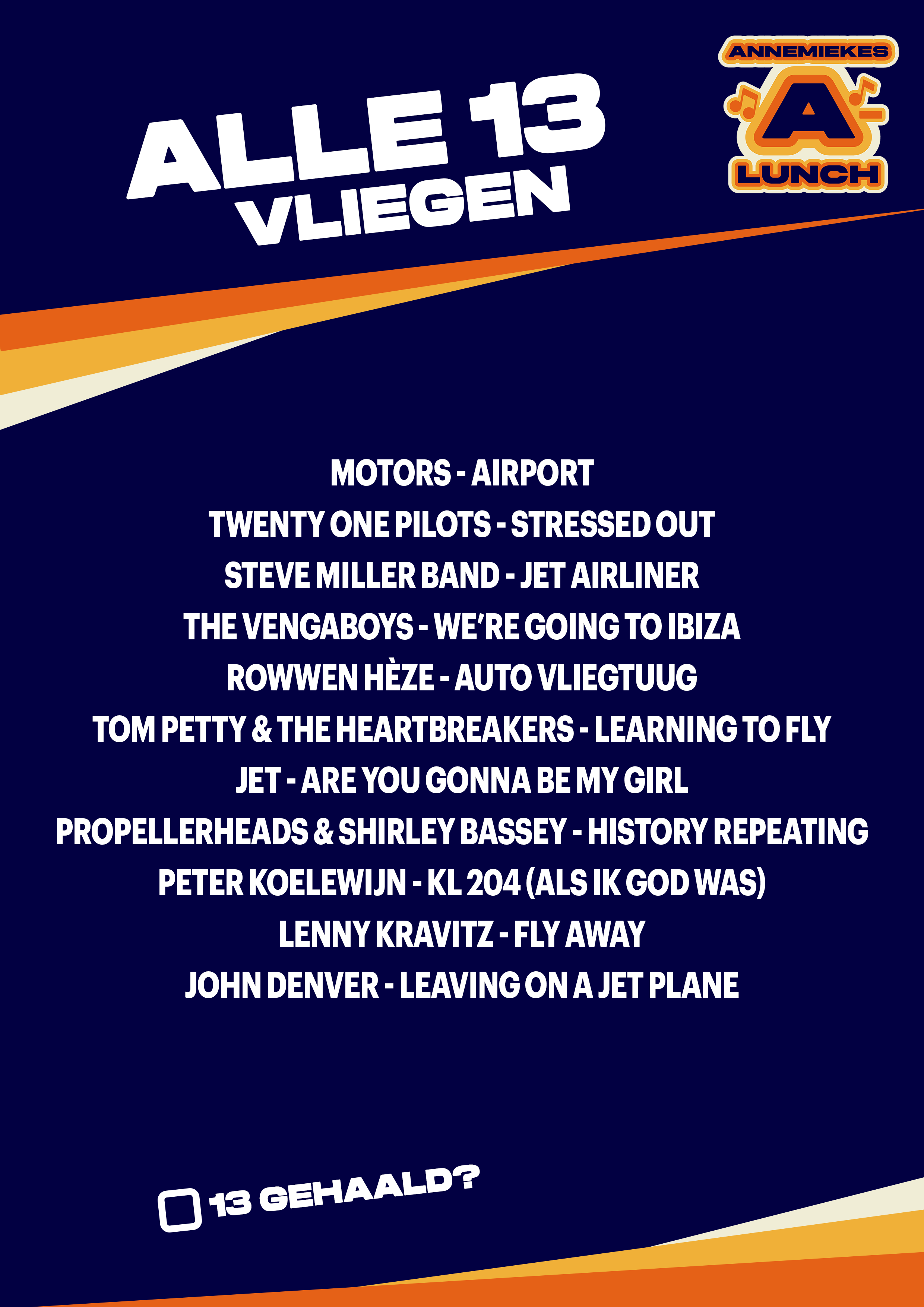 Dit thema in verband met de drukte op Schiphol, waar mensen continu verschrikkelijk hard aan het werk zijn de lange rijen te verhelpen. Gerard bedacht het thema onderweg naar de luchthaven en kan nu niet live meeluisteren… Gelukkig is alles terug te vinden. Dit was Alle 13: Vliegen!