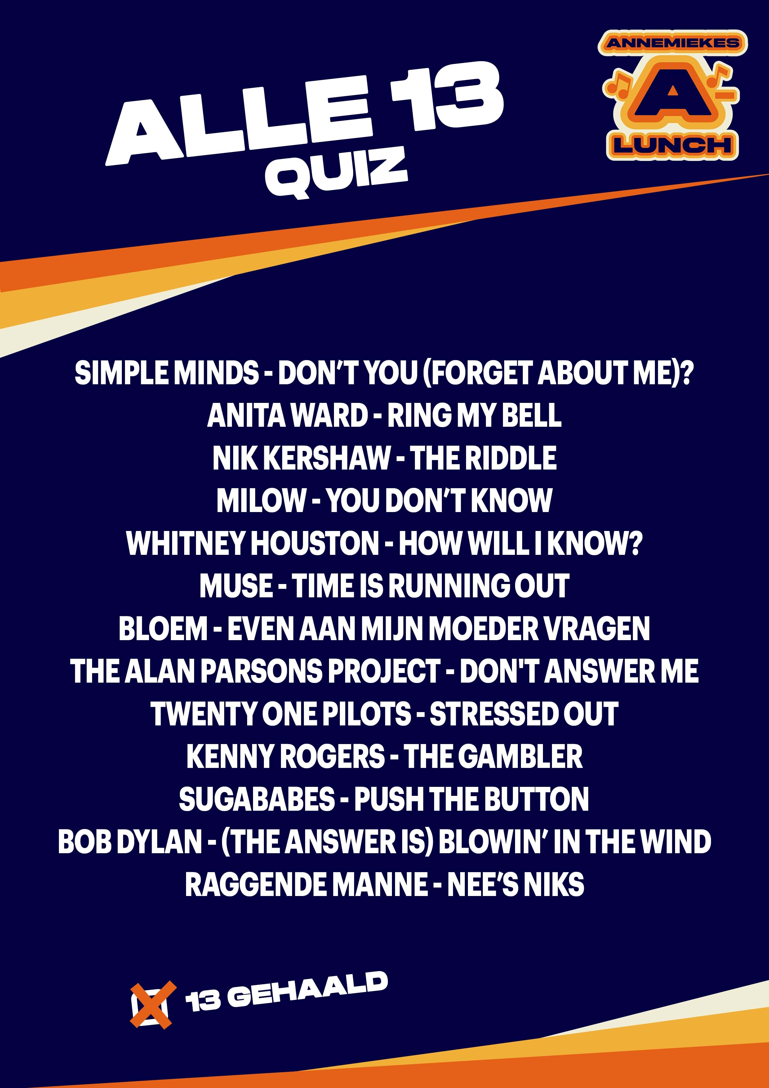 Staat jouw plaat er niet tussen? Probeer het volgende week nog een keer tijdens een nieuwe Alle 13! Heb je een idee voor een leuk thema? Ook deze kun je insturen via de NPO Radio 2 app.