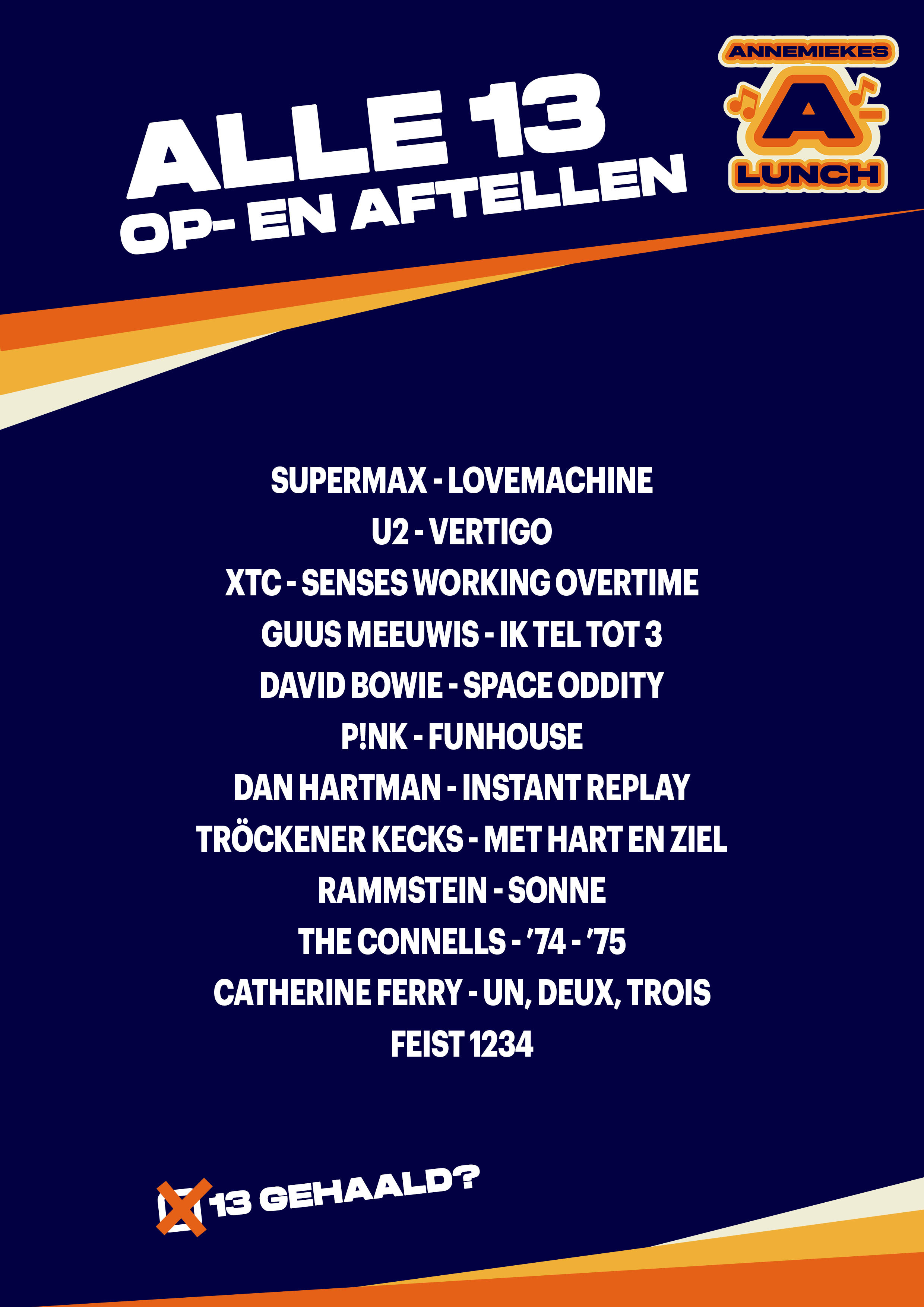 Staat jouw plaat er niet tussen? Probeer het volgende week nog een keer tijdens een nieuwe Alle 13! Heb je een idee voor een leuk thema? Ook deze kun je insturen via de NPO Radio 2 app.
