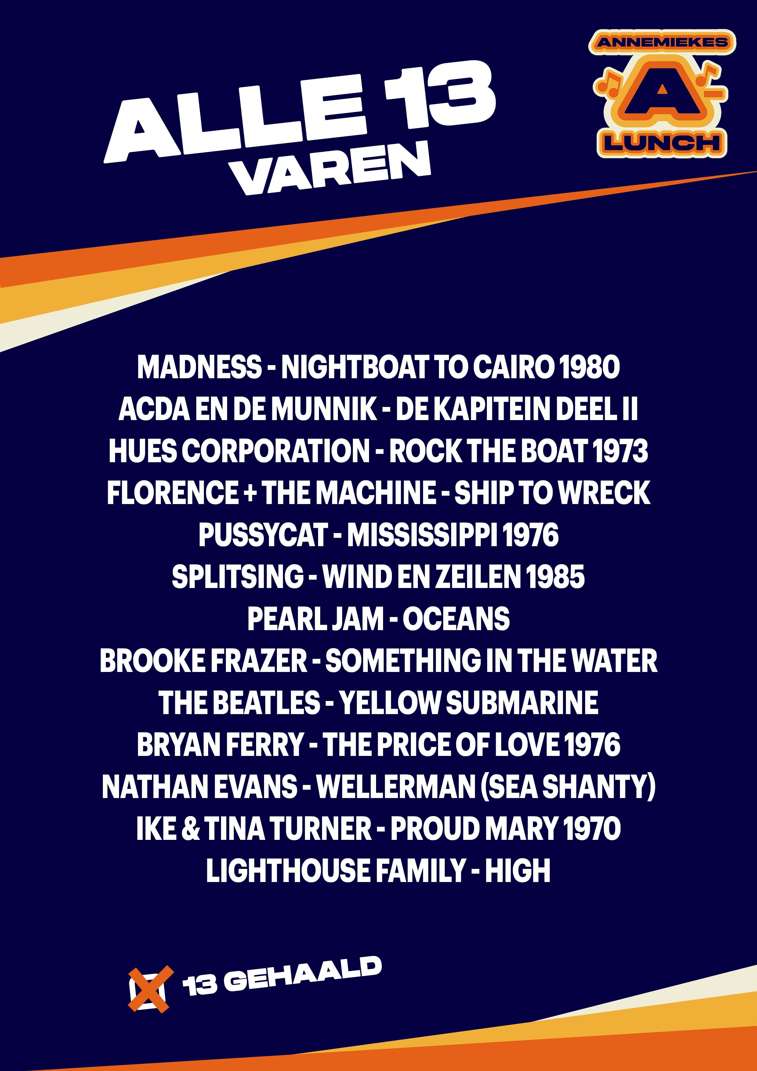 Luisteraar Mark had een leuk idee voor een Alle 13 op Hemelvaart: Alle 13 Varen! Dit zijn de 13 aangevraagde tracks, allen in nautisch thema.