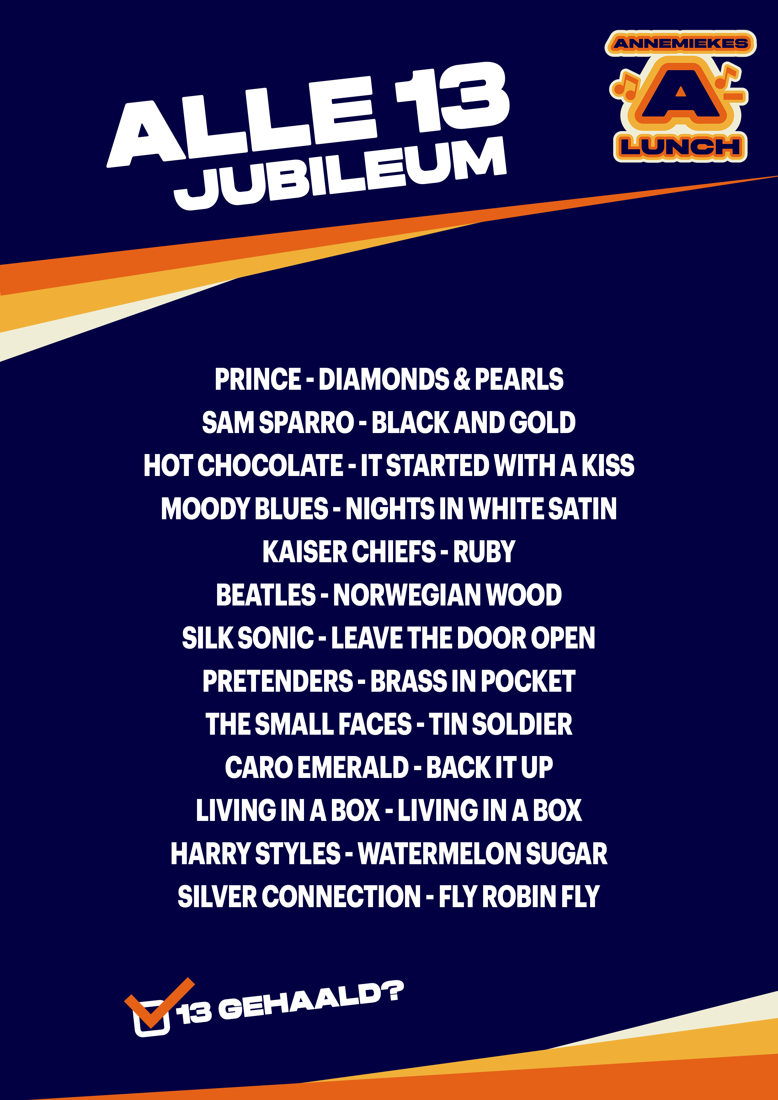 Staat jouw plaat er niet tussen? Probeer het volgende week nog een keer tijdens een nieuwe Alle 13! Heb je een idee voor een leuk thema? Ook deze kun je insturen via de NPO Radio 2 app.