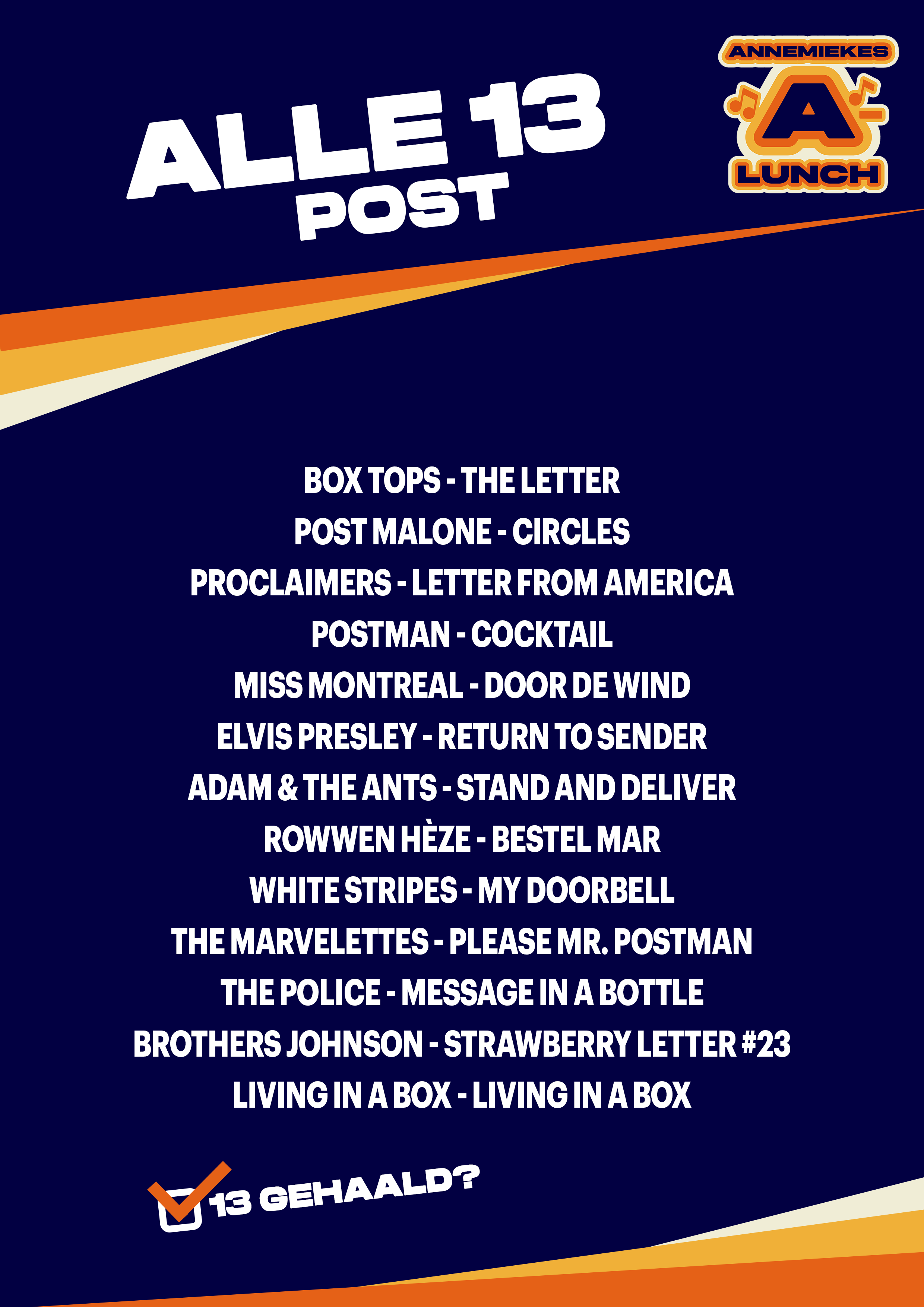 Luisteraar Stefan steekt tijdens de A-Lunch alle post- en pakketbezorgers een hart onder de riem met een heerlijk nieuw Alle 13 thema! Deze vrijdag gingen we op zoek naar ‘Post’ platen…