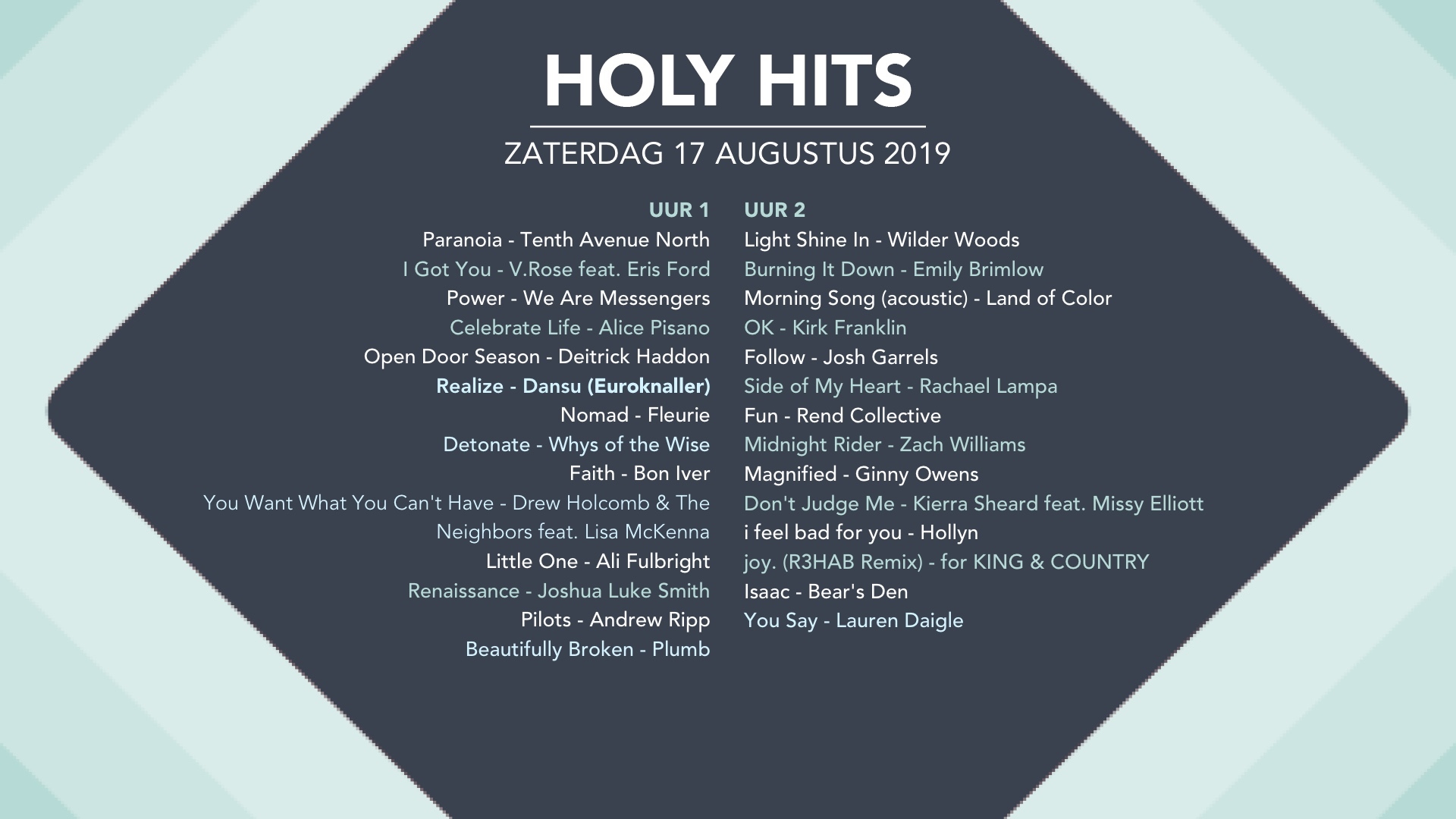 Hier vind je de playlist van Holy Hits #32, uitgezonden op 17 augustus 2019.