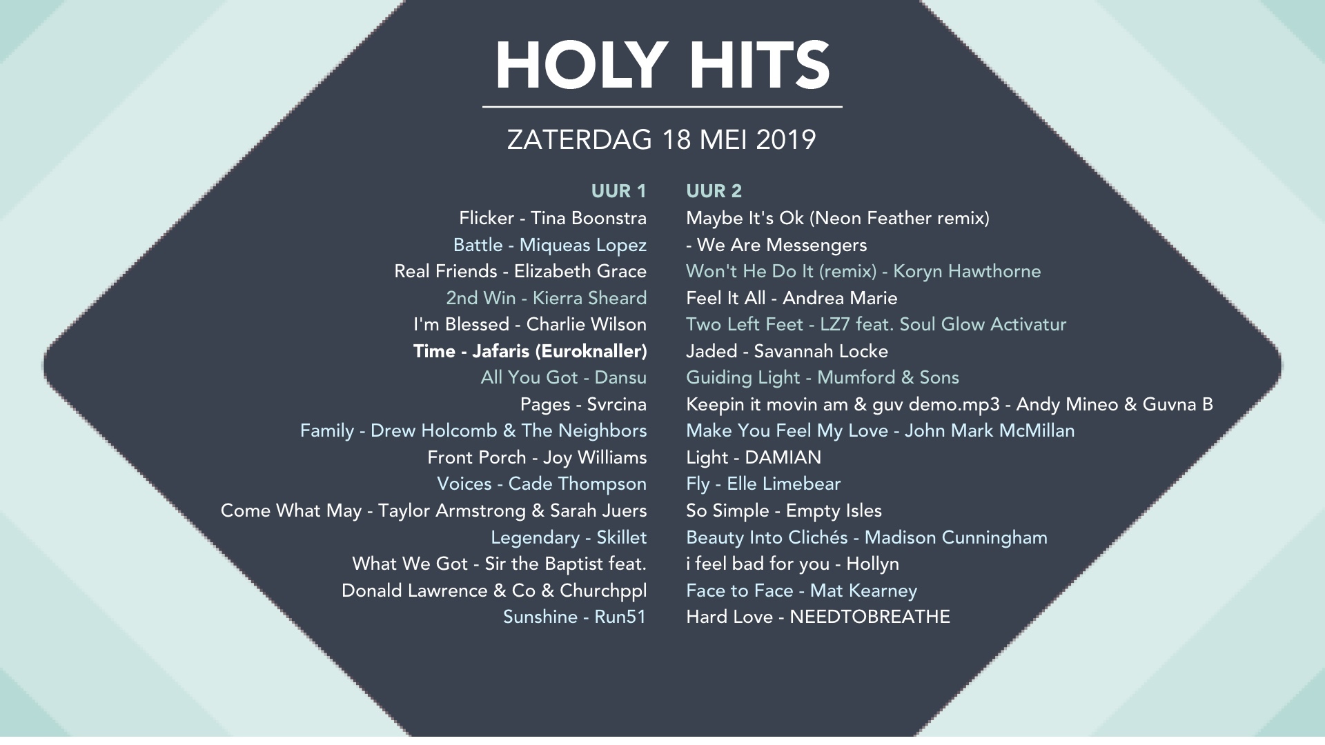 Hier vind je de playlist van Holy Hits #20, uitgezonden op 18 mei 2019.