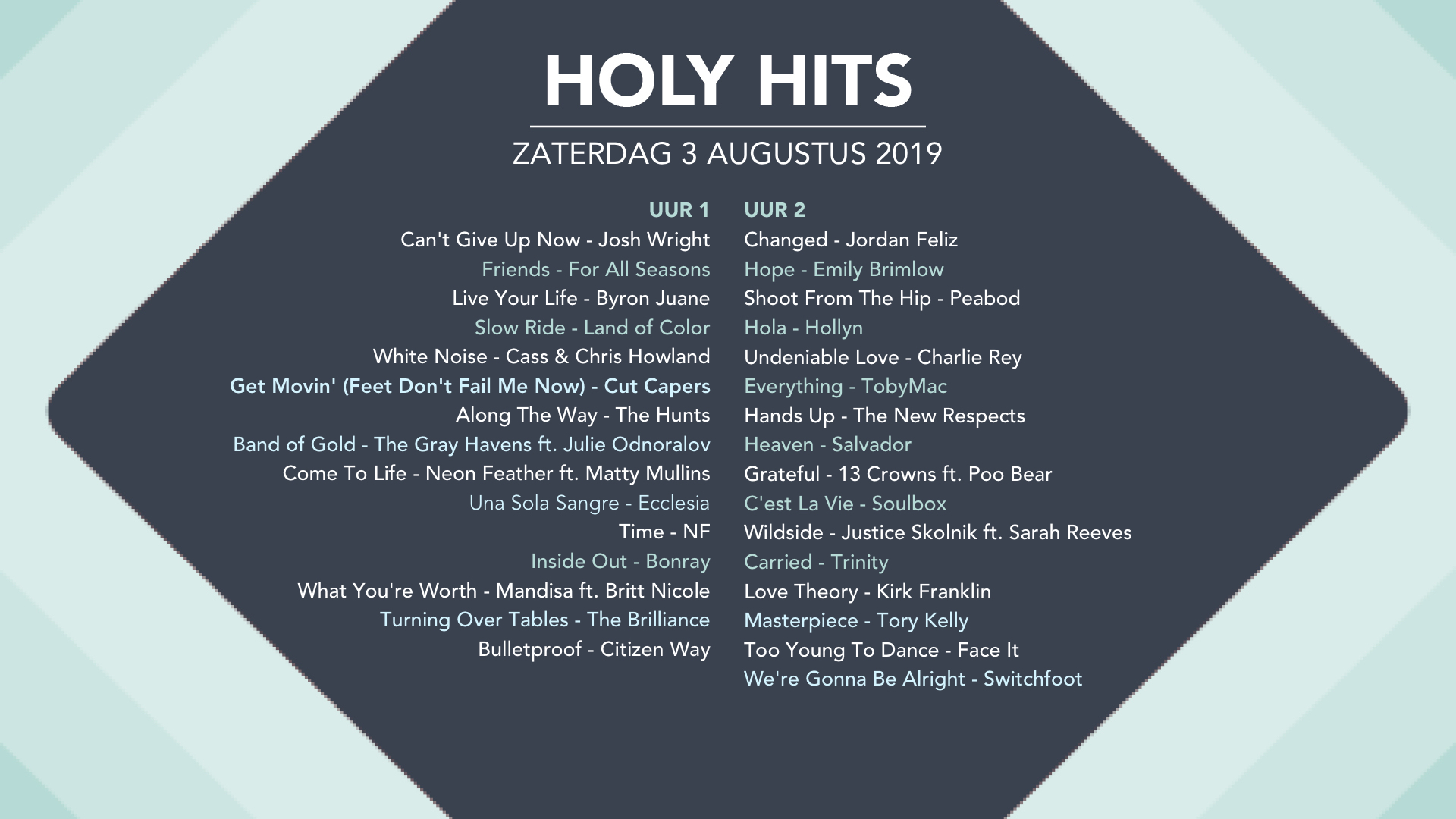 Hier vind je de playlist van Holy Hits #30, uitgezonden op 20 juli 2019.
