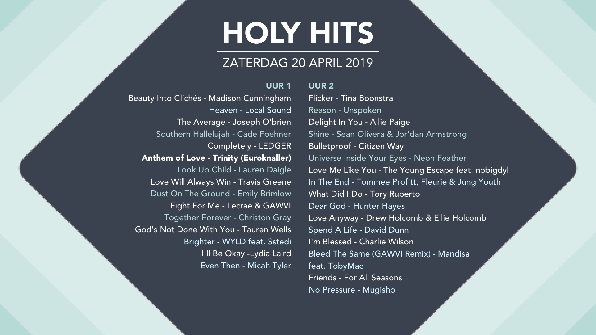 Hier vind je de playlist van Holy Hits #16, uitgezonden op 20 april 2019.