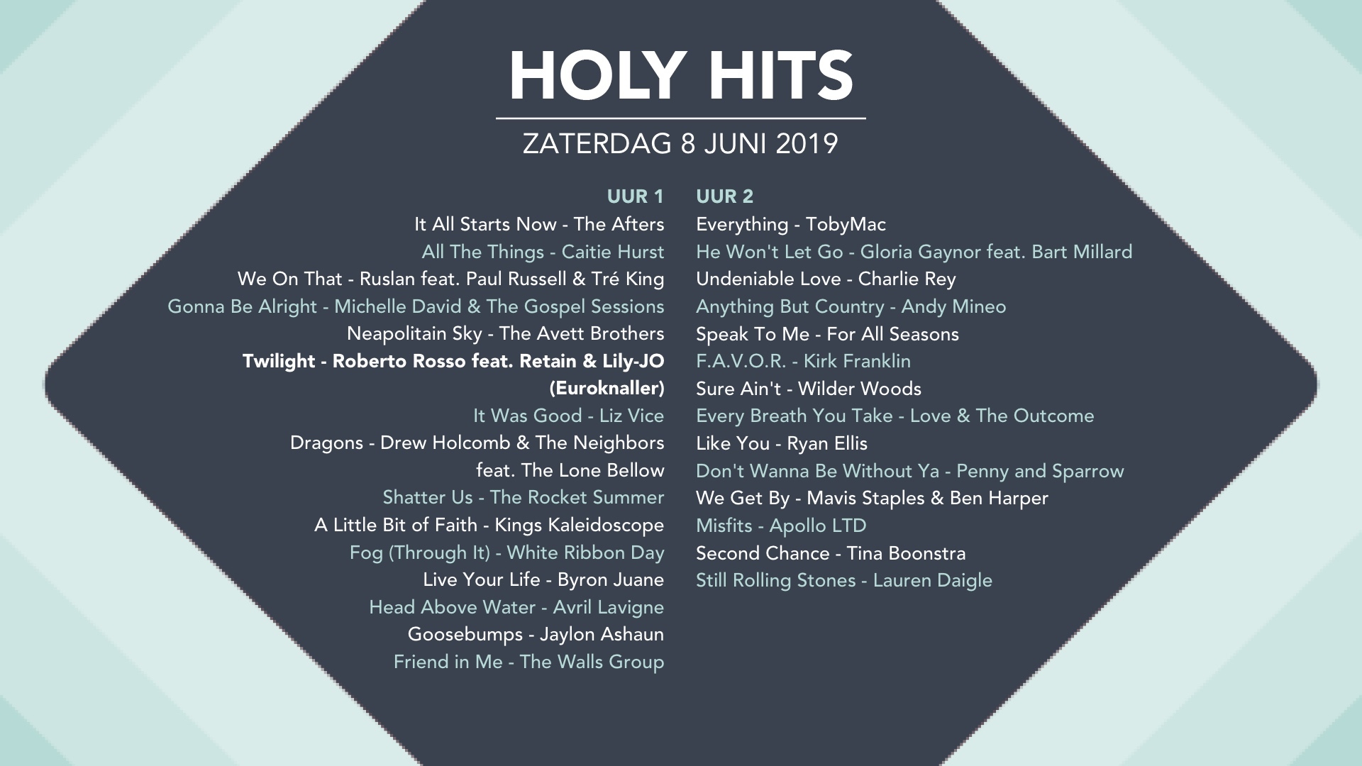 Hier vind je de playlist van Holy Hits #23, uitgezonden op 8 juni 2019.