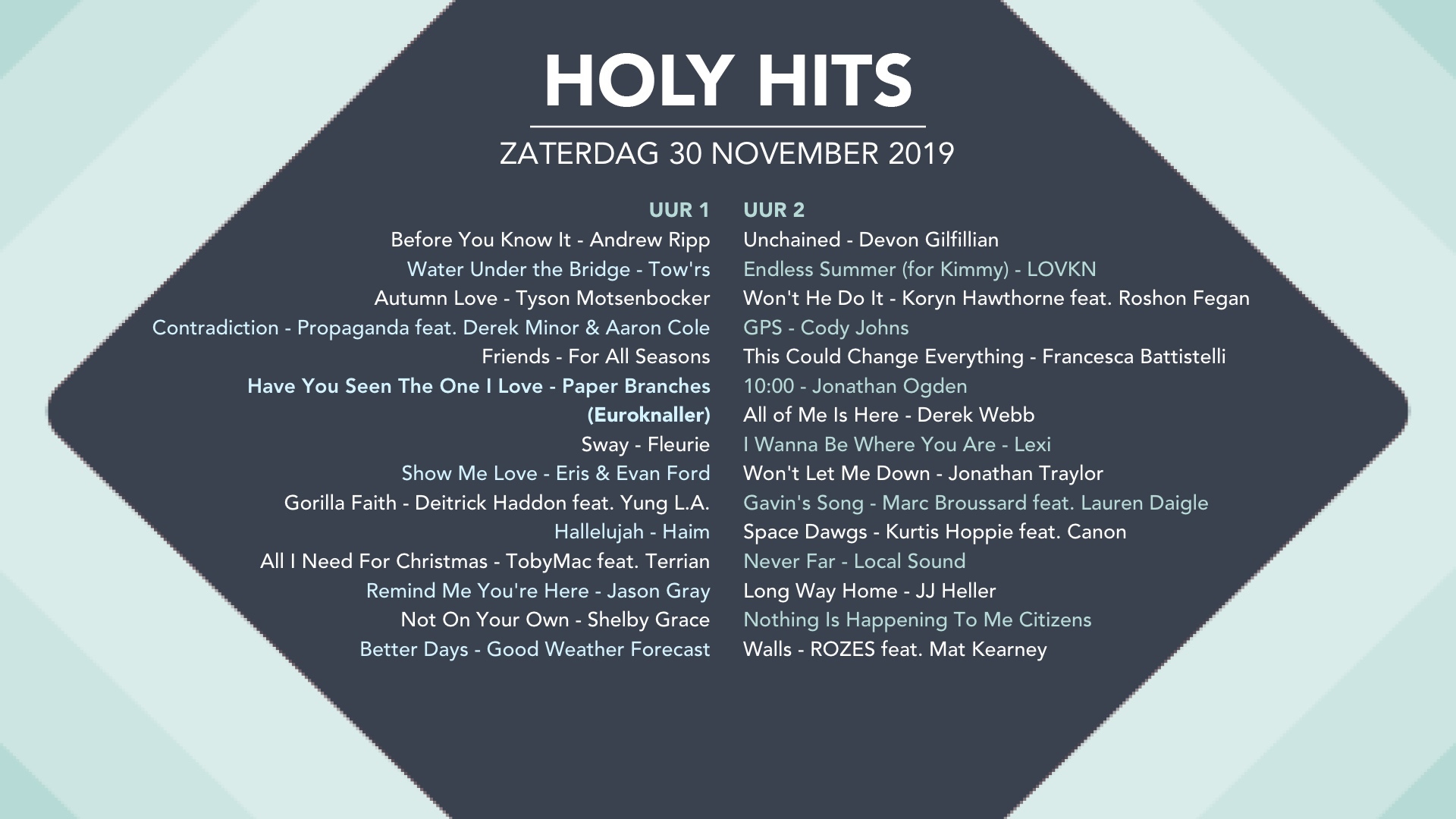 Hier vind je de playlist van Holy Hits #46, uitgezonden op 30 november 2019.