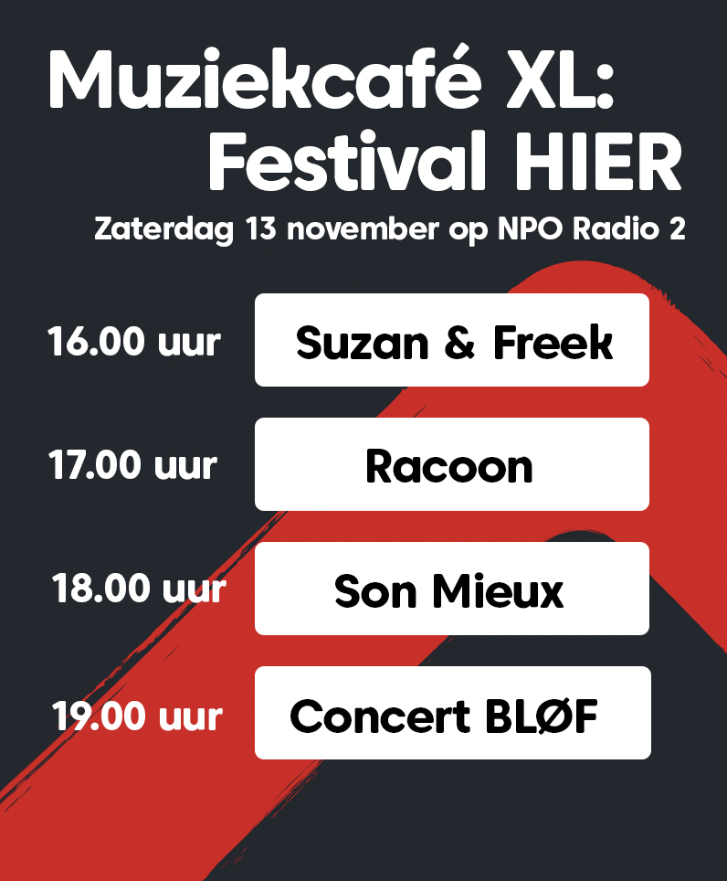 Morgenmiddag kan je op NPO Radio 2 genieten van livesessies met Racoon, Suzan & Freek en Son Mieux. Als afsluiter staat BLØF anderhalf uur op het podium in een leeg AHOY. Wij brengen Festival HIER naar je toe!