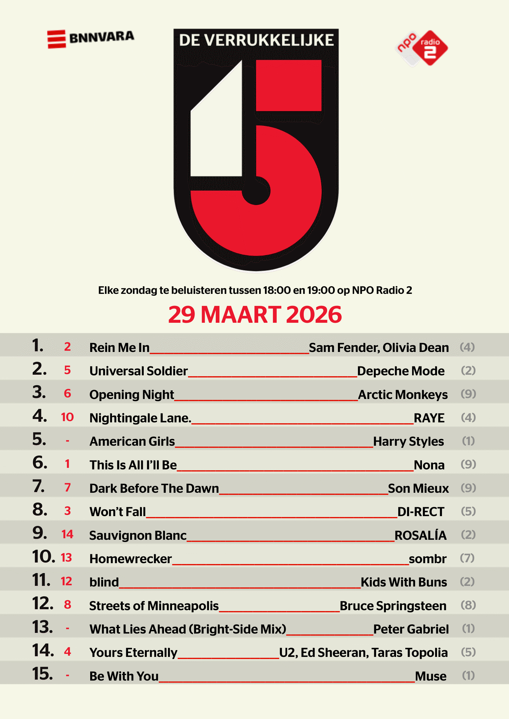 De Verrukkelijke 15De Verrukkelijke 15 van zondag 29 maart 2026foto: Ben Houdijkfoto: Bullet-RayNieuwschevron rightDe Verrukkelijke 15 van zondag 29 maart 2026foto: De Verrukkelijke 15Advertentie via ster.nlDe Verrukkelijke 15BNNVARAAdvertentie via ster.nlGerelateerd nieuwsDe Verrukkelijke 15De Verrukkelijke 15 van zondag 22 maart 2026De Verrukkelijke 15De Verrukkelijke 15 van zondag 8 maart 2026De Verrukkelijke 15De Verrukkelijke 15 van zondag 15 maart 2026De Verrukkelijke 15Bekijk hier de Verrukkelijke 15 van 1 februari 2026