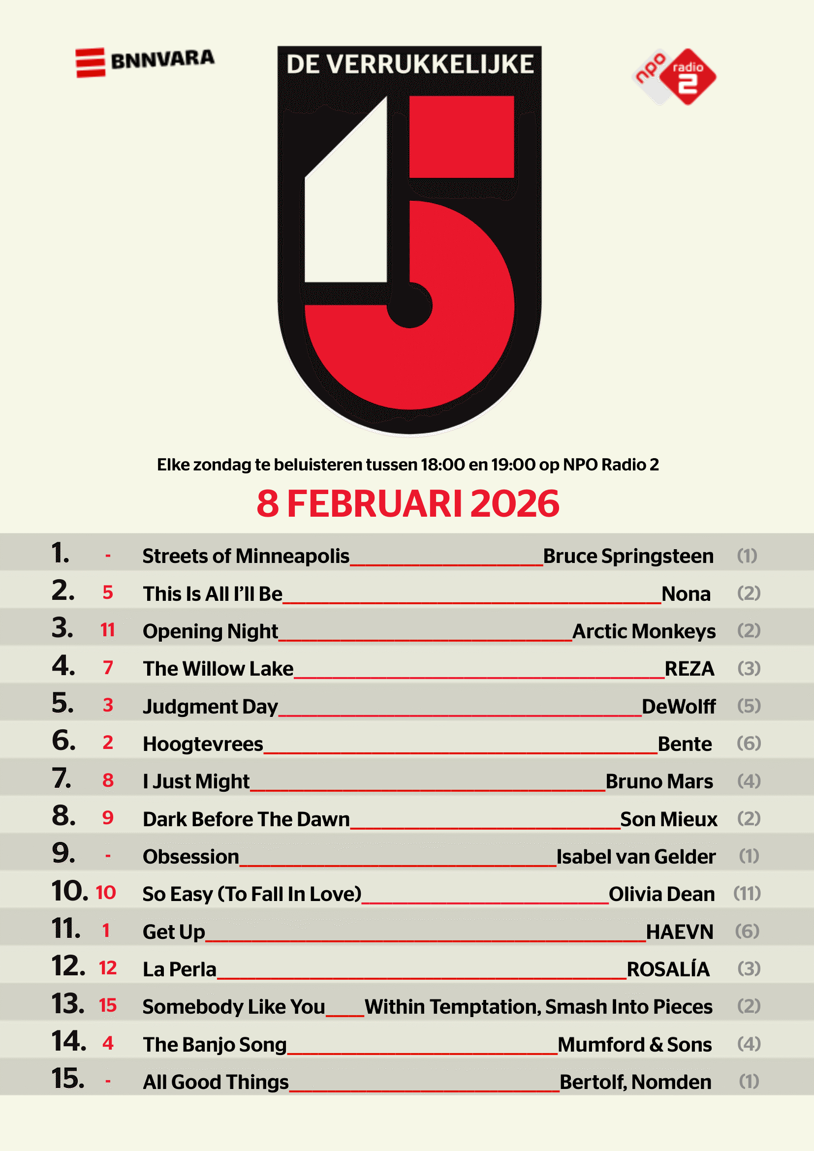 De Verrukkelijke 15De Verrukkelijke 15 van zondag 8 februari 2026foto: Ben Houdijkfoto: Ben HoudijkNieuwschevron rightDe Verrukkelijke 15 van zondag 8 februari 2026foto: De Verrukkelijke 15Advertentie via ster.nlDe Verrukkelijke 15BNNVARAAdvertentie via ster.nlGerelateerd nieuwsDe Verrukkelijke 15De Verrukkelijke 15 van zondag 18 januari 2026De Verrukkelijke 15De Verrukkelijke 15 van zondag 25 januari 2026De Verrukkelijke 15Bekijk hier de Verrukkelijke 15 van 1 februari 2026De Verrukkelijke 15De Verrukkelijke 15 van zondag 11 januari 2026