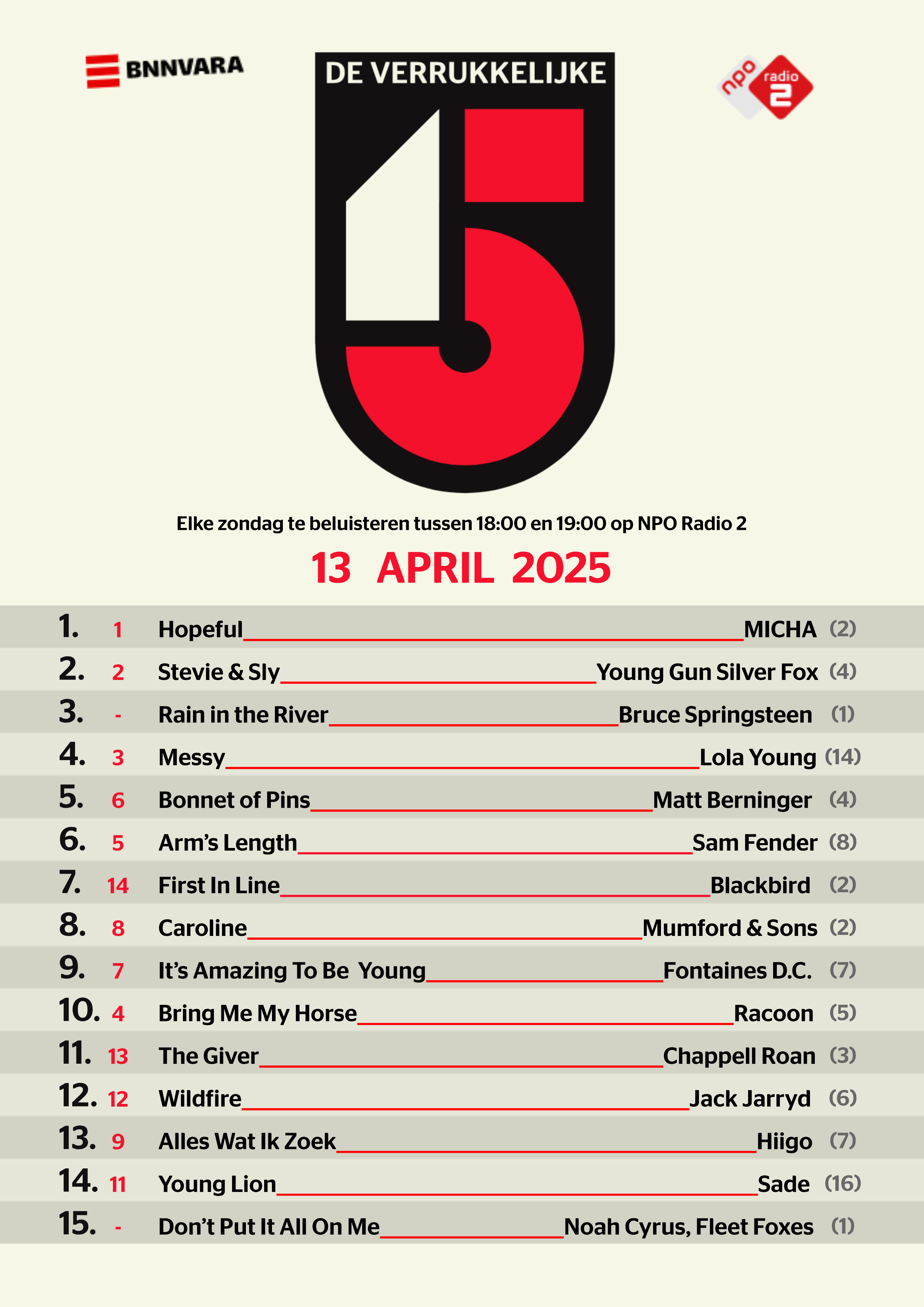 De Verrukkelijke 15De Verrukkelijke 15 van 13 april 2025foto: Bullet-RayNieuwschevron rightDe Verrukkelijke 15 van 13 april 2025foto: De Verrukkelijke 15Ster advertentieDe Verrukkelijke 15BNNVARASter advertentieGerelateerd nieuwsDe Verrukkelijke 15De Verrukkelijke 15 van zondag 16 novemberDe Verrukkelijke 15De Verrukkelijke 15 van zondag 9 novembervDe Verrukkelijke 15De Verrukkelijke 15 van zondag 30 novemberDe Verrukkelijke 15De Verrukkelijke 15 van zondag 19 oktober 2025