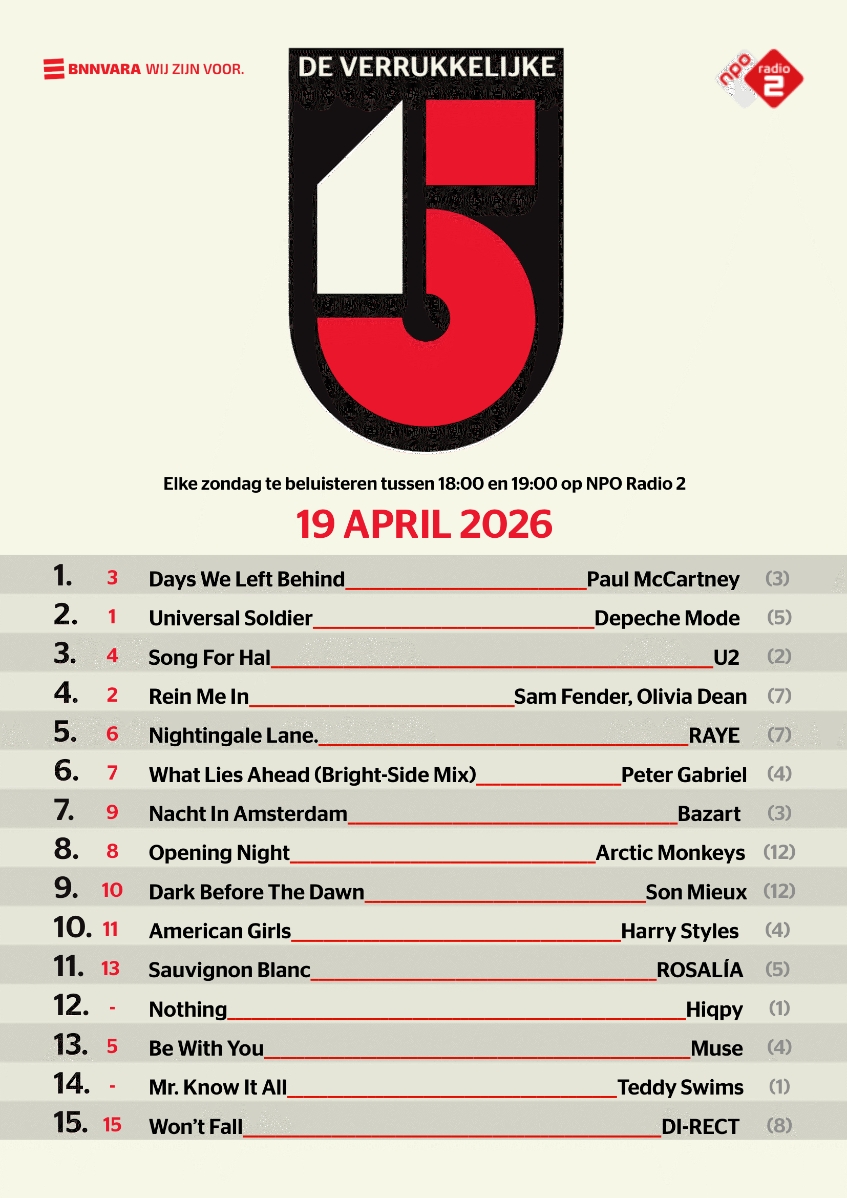De Verrukkelijke 15De Verrukkelijke 15 van zondag 19 april 2026foto: Ben Houdijkfoto: Ben HoudijkNieuwschevron rightDe Verrukkelijke 15 van zondag 19 april 2026foto: V15Advertentie via ster.nlDe Verrukkelijke 15BNNVARAAdvertentie via ster.nlGerelateerd nieuwsDe Verrukkelijke 15De Verrukkelijke 15 van zondag 29 maart 2026De Verrukkelijke 15De Verrukkelijke 15 van zondag 12 april 2026De Verrukkelijke 15De Verrukkelijke 15 van zondag 5 april 2026De Verrukkelijke 15De Verrukkelijke 15 van zondag 22 maart 2026