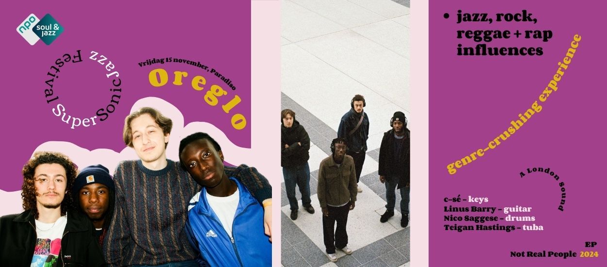 De in de hotspot Londen gevestigde groep Oreglo – bestaande uit C-sé op toetsen, Linus Barry op gitaar, Nico Saggese op drums en Teigan Hastings op tuba – maakt razendsnel naam. Gedreven door een gedeelde passie voor het samensmelten van jazz, rock, reggae en rap, creëert dit viertal een unieke sound. Ondanks hun korte bestaan gaat het ze al voor de wind. In 2023 werden ze door Ezra Collective verkozen tot winnaar van de Cross The Tracks Emerging Artists competitie, stonden ze in het voorprogramma van Gabriels, en componeerden ze muziek voor de Noord-Amerikaanse tour van The 1975. Vrijdag (morgen) zijn ze in Amsterdam, klaar om te spelen op het Super-Sonic Jazz Festival.