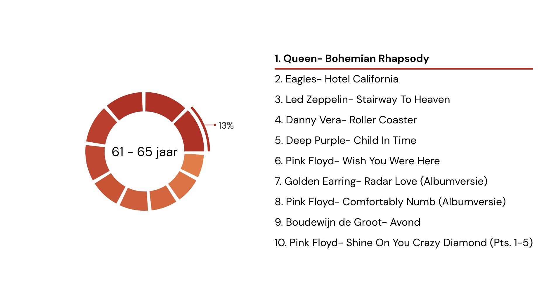 Een lijst vol klassiekers: dat is de Top 10 van 61- tot 65-jarigen. Zet stemmen Bohemian Rhapsody van Queen op één en ook Pink Floyd is sterk vertegenwoordigd in deze Top 10. Zo staat de band op de 6e en 10e plek in deze Top 10: met Wish You Were Here en Shine On You Crazy Diamond (Pts. 1-5).