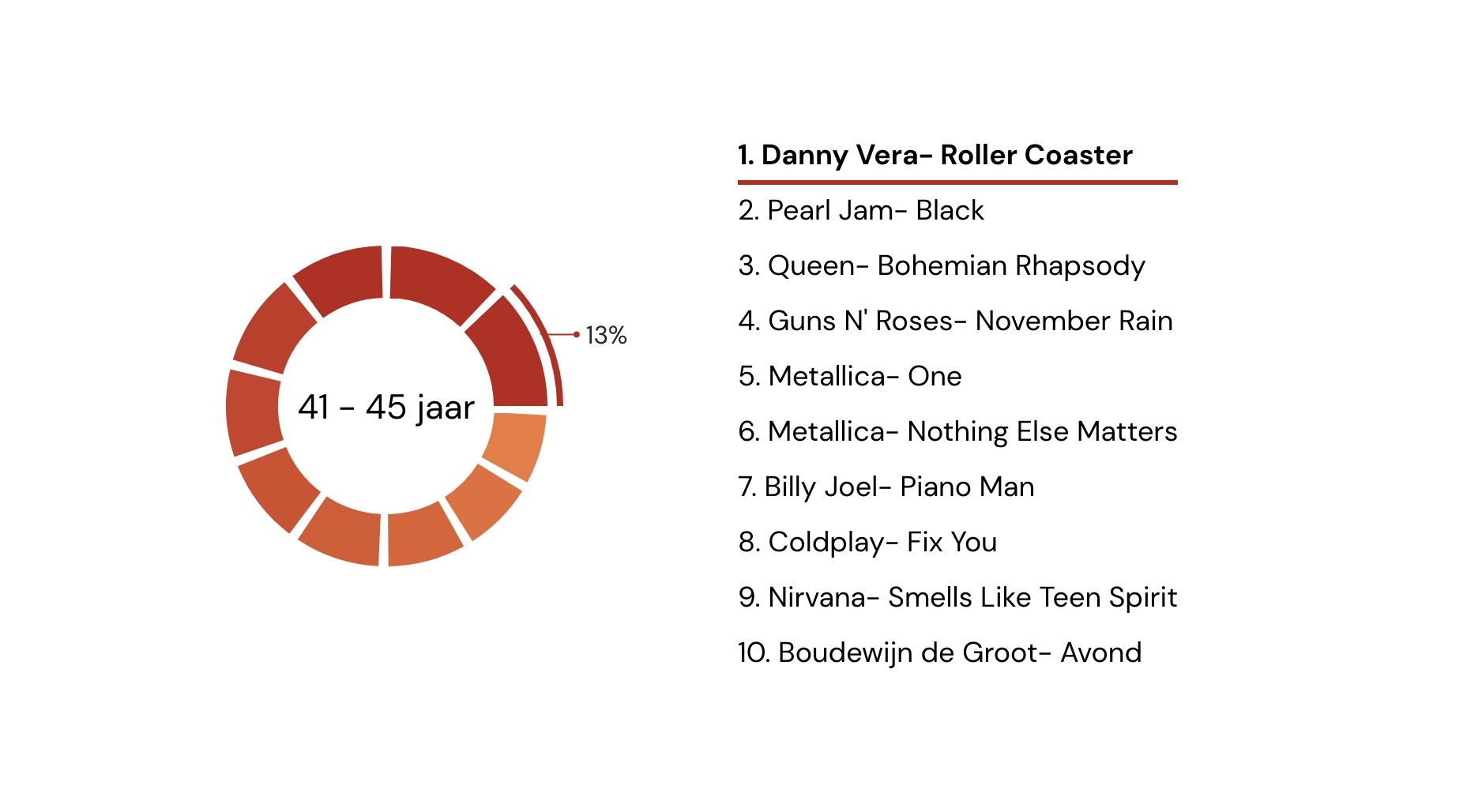 De 40-jarigen gaan voor harde gitaren! Guns N’ Roses scoort met November Rain goed in deze leeftijdsgroep en eindigt op nummer 4. Ook Metallica en Nirvana worden goed vertegenwoordigd in deze Top 10. Ook opvallend: dit is de enige groep die Roller Coaster van Danny Vera nog de hoogste notering geeft.