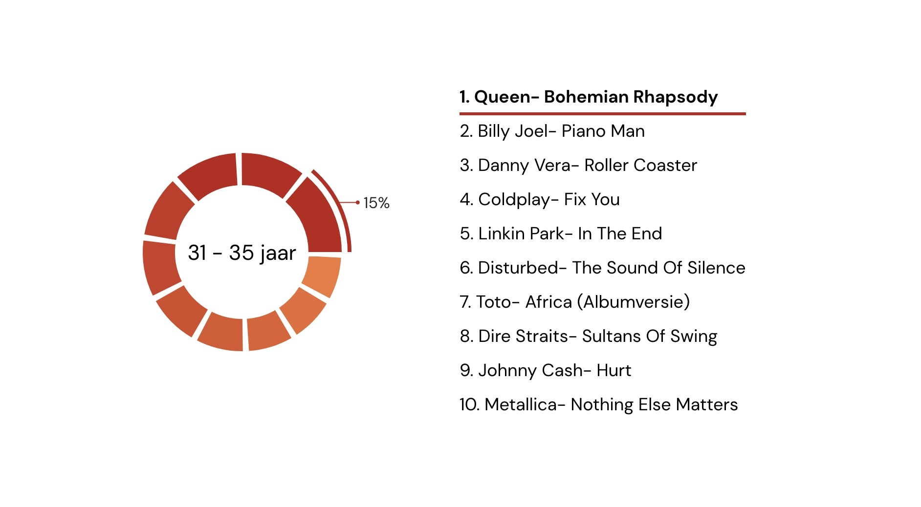 Waar in 2020 Roller Coaster van Danny Vera nog bovenaan de Top 10 van 31- tot 35-jarigen stond, staat Bohemian Rhapsody twee jaar later weer bovenaan de lijst. Danny Vera moet dit jaar genoegen nemen met een derde plek in de Top 10 van deze leeftijdsgroep. Ook Disturbed krijgt van deze groep flink wat stemmen met hun cover van The Sound Of Silence.