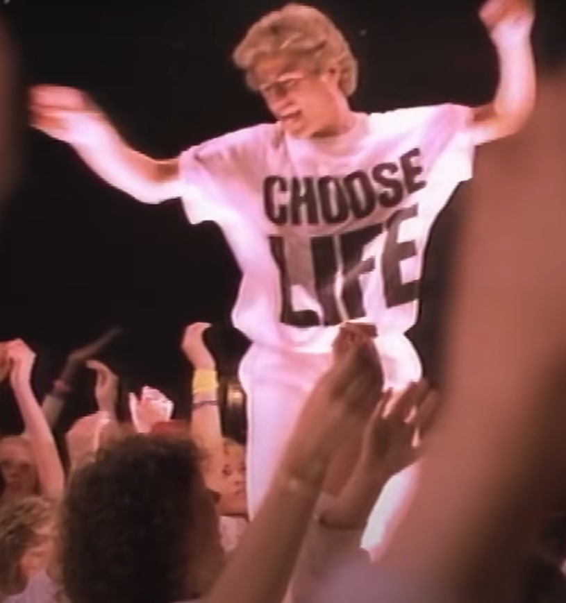George Michael in de clip van Wake Me Up Before You Go Go met het 'choose life'-shirt